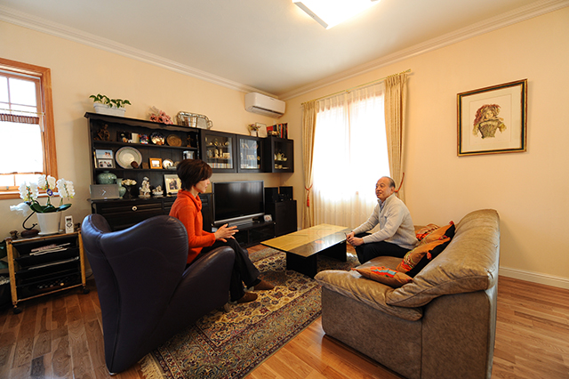 リビングの色のコーディネートは打ち合わせを何度も重ね、特にエコウォールは、白ベースのピンクベージュという独特な色合いです。