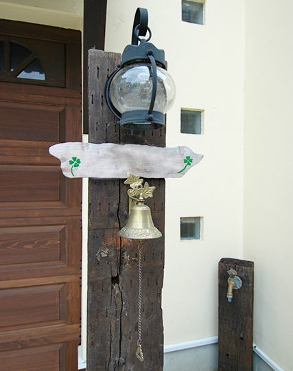 玄関は重厚感のあるアンティーク無垢ドア。 瓦のひさしがヨーロピアンな雰囲気と“本物らしさ”を醸し出しています。